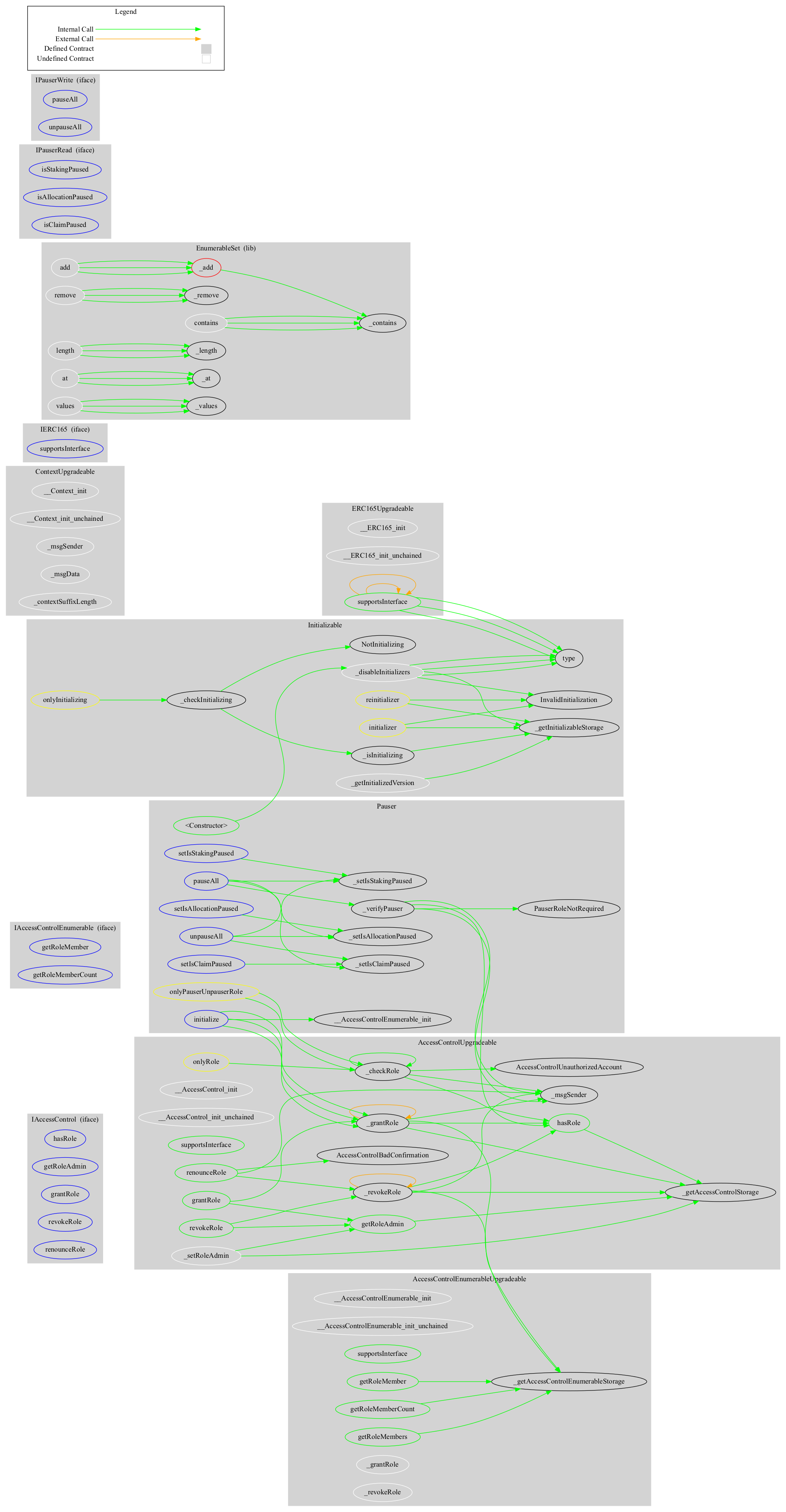 PAUSERThe Pauser contract works with the StakingERC20 contract to manage the pausing of staking functions. Upon deployment, the Default Admin, Pauser, and Unpauser roles are assigned to specified addresses. The Pauser role can pause deposits and withdrawals from the StakingERC20 contract at any time, while the Unpauser role can resume these actions. Both the Pauser and Unpauser roles can also independently pause or unpause the allocation and claim flags, or all three flags simultaneously, although the allocation and claim flags are not enforced within the StakingERC20 contract. The Default Admin has the authority to grant or revoke any role from any address as needed.