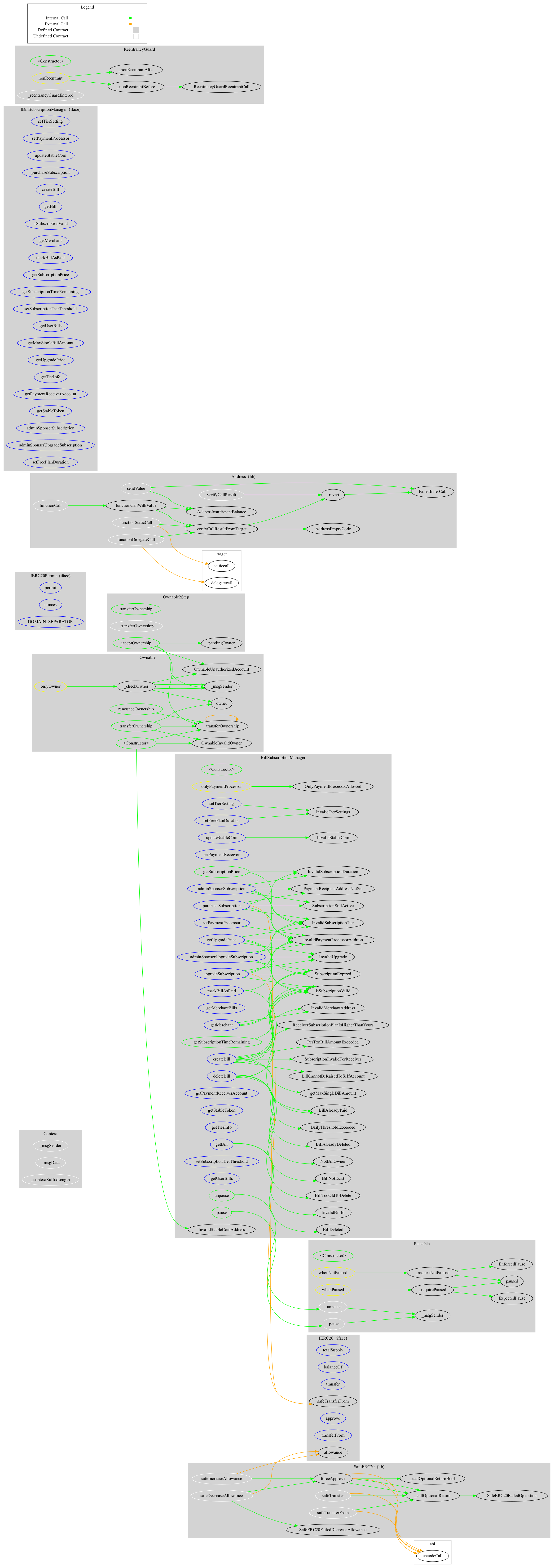 BillSubscriptionManagerThis contract enables users to manage their subscriptions on the platform. Users can purchase a subscription for a specified tier for any number of months, paying in the contract's designated stable token. The subscription cost is determined by the tier's price and the duration purchased. Price changes may apply for multi-month purchases based on the tier's discount percentage. Alternatively, users can claim a one-time subscription to the free trial tier, which is valid for the designated free trial period. Users may also upgrade an existing subscription by paying the price difference between their current tier and the desired one for the remaining duration of the subscription.