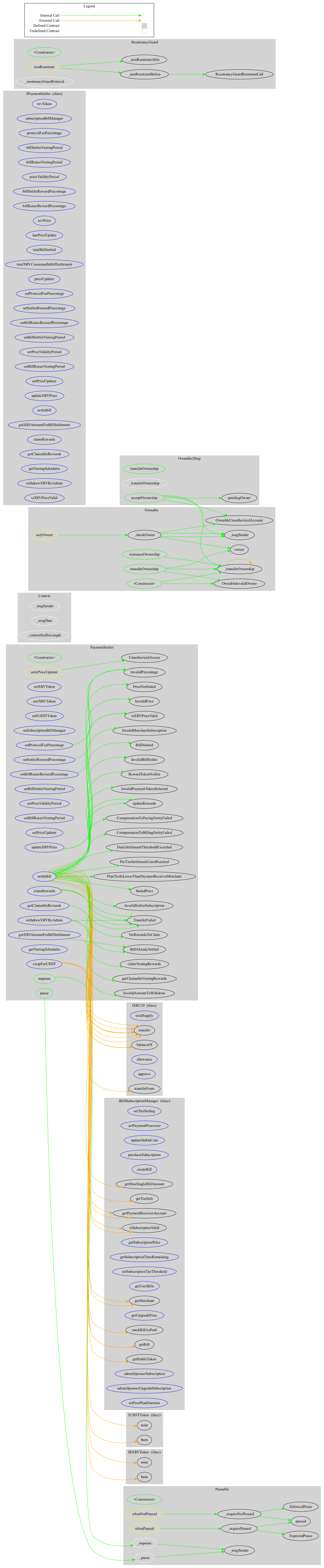 PaymentSettlerThis PaymentSettler contract allows users to settle bills if the bill's payment token is set to either "IUSDT" or XRV. Both the settler and the merchant must have valid subscriptions for a bill to be settled. Additionally, the bill amount must not exceed the maximum single bill settlement limit defined by the merchant's subscription tier, and the merchant's total payments received in a day must remain within their tier's daily settlement threshold. The bill amount is converted into XRV using the contract's current XRV price. The project team must ensure that the XRV price is constantly updated to avoid arbitrage using bill payments, as users can receive stablecoins based on the current XRV price.