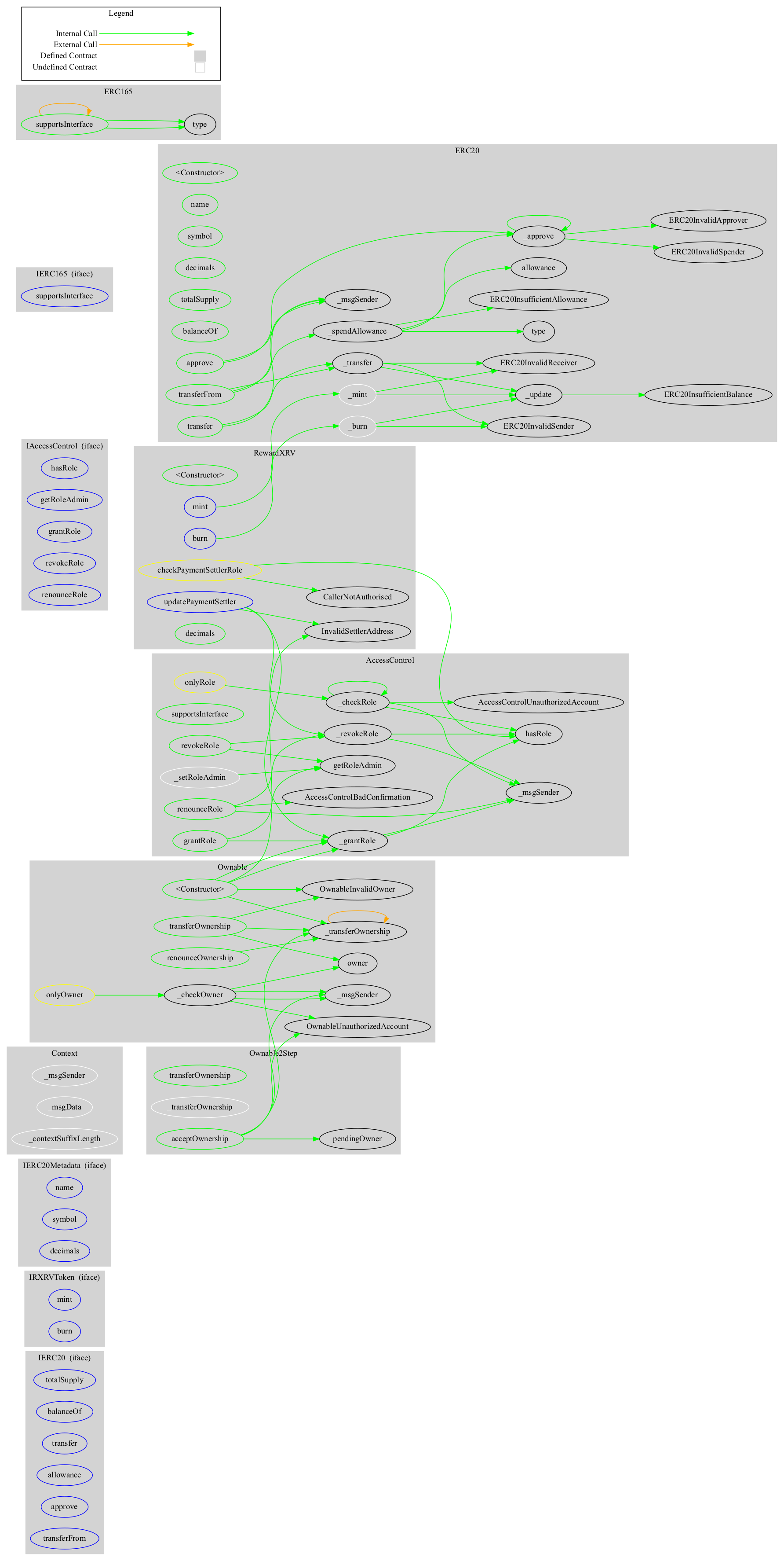 rXRVrXRV, or RewardXRV, is a new token used as a reward mechanism within the PaymentSettler contract. The Settler Role, initially assigned to the PaymentSettler contract upon deployment, can mint or burn rXRV tokens from any address. The Default Admin role, which is granted to the owner upon deployment, holds authority over role management. The Default Admin can grant or revoke the Settler Role for any address. Additionally, the owner can update the PaymentSettler address, assigning the Settler Role to the new address while revoking it from the previous one.